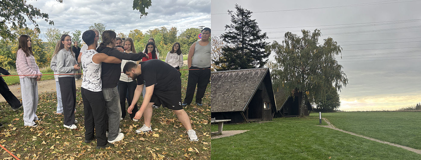 Am Nachmittag haben wir ein paar Teambuilding-Spiele gespielt. Beim Namensspiel stand man sich gegenüber, und wenn der Vorhang fiel, musste man so schnell wie möglich den Namen des anderen sagen – das war richtig lustig! Danach kam das „Gefängnisspiel“, bei dem wir gemeinsam über gespannte Seile klettern und uns gegenseitig helfen mussten, „auszubrechen“. Das hat total Spaß gemacht und man musste richtig gut zusammenarbeiten.