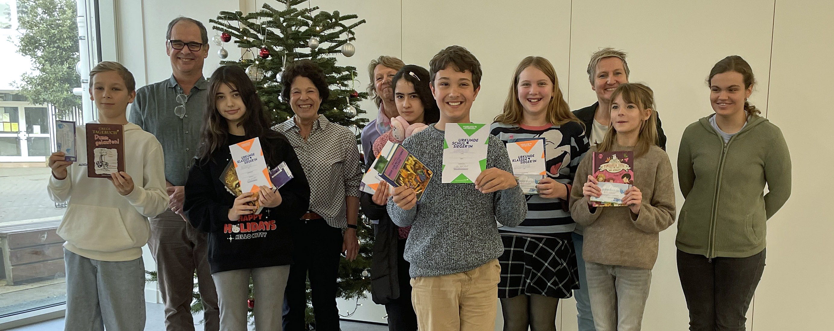 Beim Vorlesewettbewerb der 6. Klassen der Geschwister Scholl Schule beeindruckten die Jugendlichen in diesem Jahr mit hoher Lesefertigkeit. Unterstützt von einigen Mitschülerinnen und Mitschülern und ihrer Lehrerin Tanja Herzog traten am 11. Dezember 2025 sechs Leserinnen und zwei Leser in unserer Mensa vor die Jury. Diese bestand aus Vorjahressiegerin Sofia Lopez Nieto, Büchereimitarbeiterin Marika Leibe, Lesepatin Anette Kern, unserer Konrektorin Katrin Hechler sowie einem weiteren Lesepaten, Peter Mann.