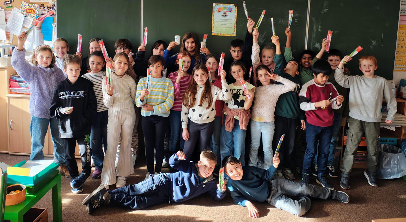 Am 11.11.2025 kam die Zahnfee höchstpersönlich in die Schule, um den Preis zu überreichen. Jedes Kind durfte sich über nützliche Accessoires zum Zähneputzen freuen. Zusätzlich erhielt die Klasse 200 € für die Klassenkasse.